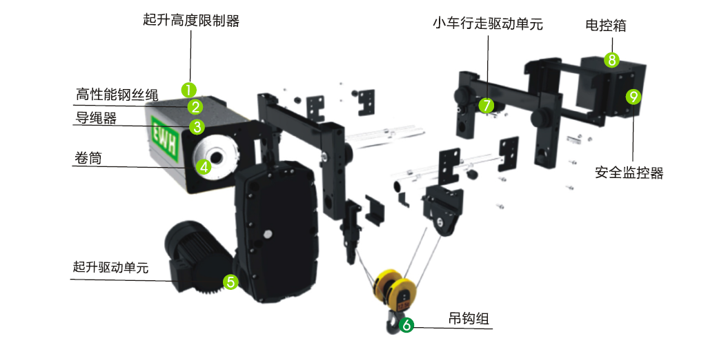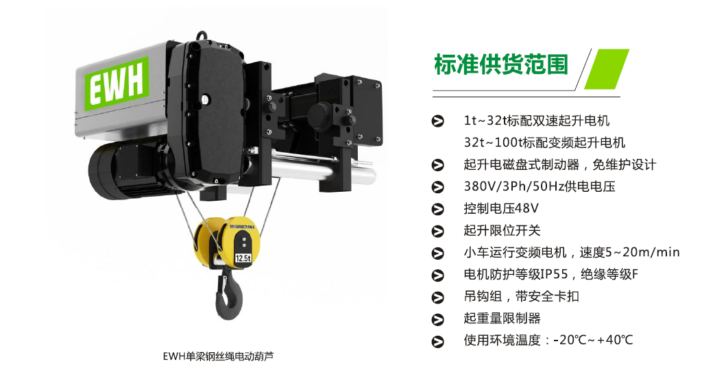 起升机构 (欧式钢丝绳葫芦)法兰泰克凭借的技术和丰富的行业经验,从客户的需求出发,基于模块化设计理念,研发出拥有多项的EWH系列钢丝绳电动葫芦:质量好,性能好。EWH电动钢丝绳葫芦能够为您提供更好的物流搬运解决方案,保障设备运行的安全性。